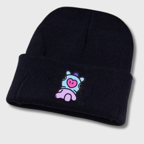 Here is our black cotton beanie with a BT21 character depicted on it. Choose the mascot you want to accompany you on your head from the different BT21 characters we can offer: Tata, Mang, Shooky, Cooky, Chimmy, RJ, Koya, and even Van!