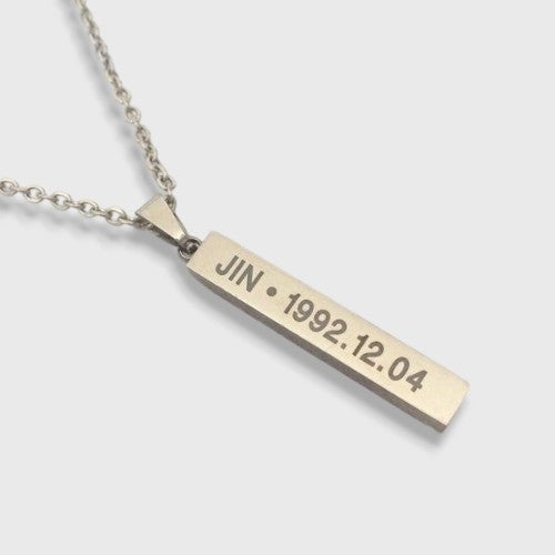 Discover the BTS Jewelry in silver, this necklace for Army is available in different variants. It has the name of a BTS group member as well as their date of birth inscribed.