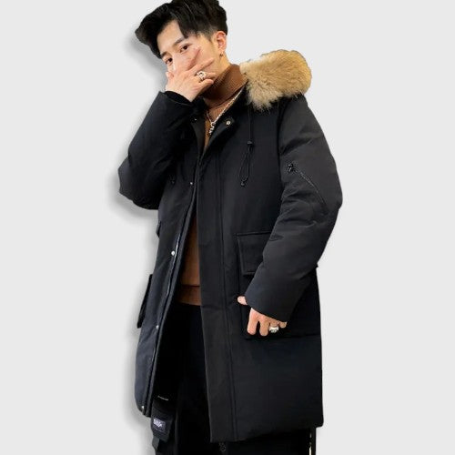 Discover winter elegance with this men's Korean parka. Designed to withstand the coldest temperatures while staying stylish, this parka features a luxurious faux fur hood that offers both warmth and sophistication. Whether you're heading to a meeting or an outdoor outing, this parka adapts to all your outfits.