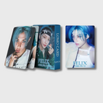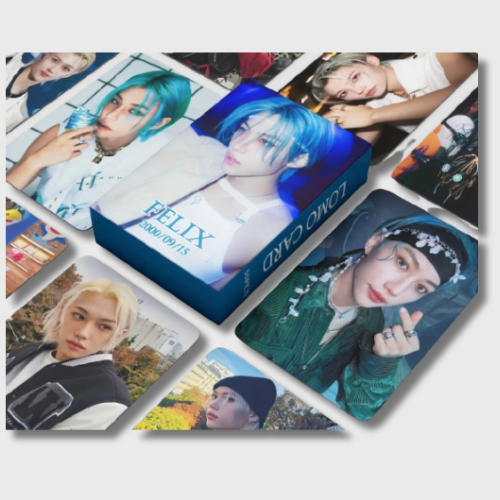 Our set of 55 Felix photocards lets you discover new and exclusive images of Felix, iconic member of the Stray Kids group. Each card is printed with vibrant colors and sharp details that do not fade over time. Designed to last, they resist wear and can be kept in an album, displayed, or traded among fans.