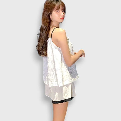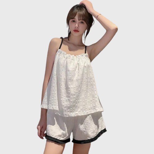 With its thin straps and loose fit, this Korean women's pajama perfectly adapts to all body shapes. The pure white evokes a feeling of freshness and lightness, perfect for warm nights. Its soft texture to the touch wraps the skin in a cocoon of softness, creating a pleasant sensation throughout the night.