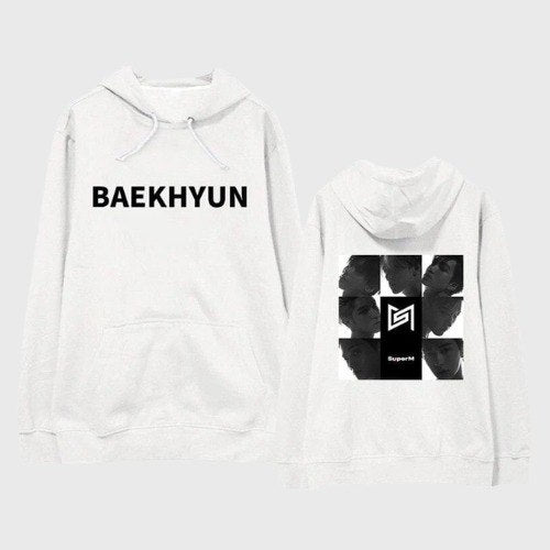 White KPOP sweatshirt of the group Super M with the name of a group member written on the front and a photo of the different artists of the group on the back.