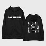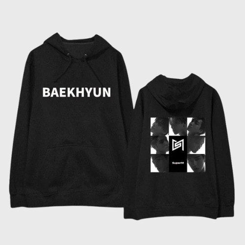 Black KPOP sweatshirt of the group Super M with the name of a group member written on the front and a photo of the different artists of the group on the back.