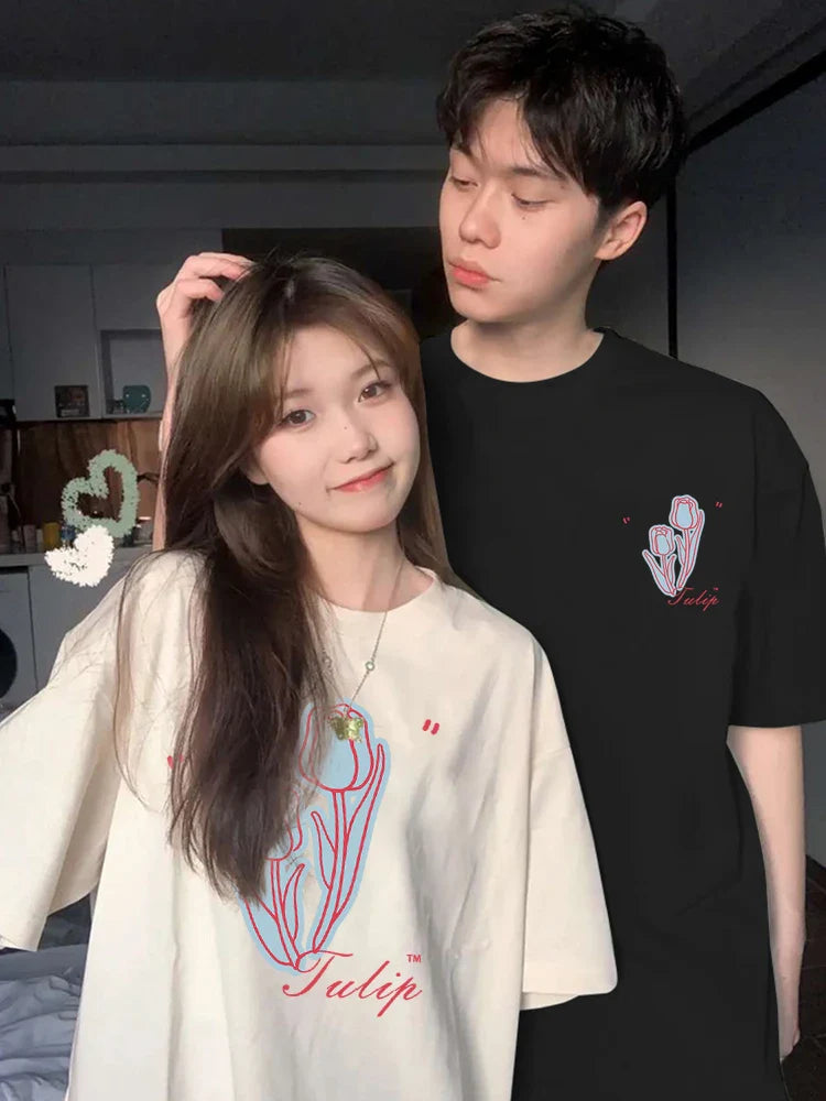 Express your connection and style with this Korean t-shirt. It is an ideal piece for couples who want to showcase their unique bond while staying at the forefront of fashion. Inspired by Korean trends, this t-shirt offers you a loose and relaxed fit, perfect for a modern and comfortable look for two.