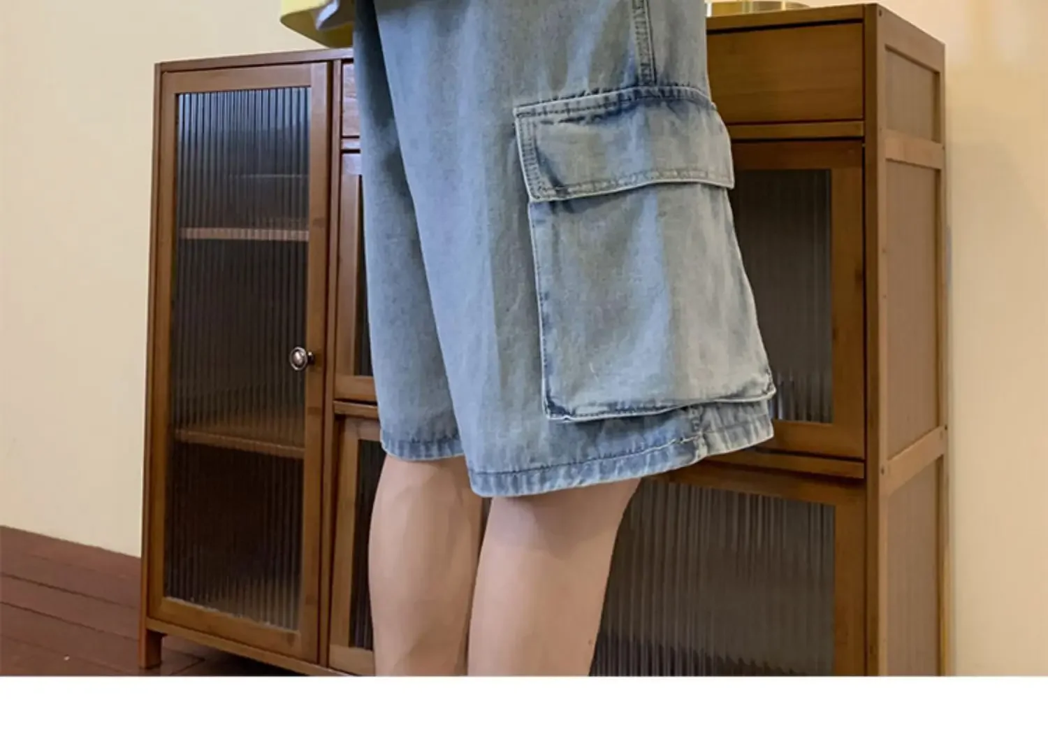 Shorts de mezclilla cargo con bolsillos grandes para hombre, verano, delgados, sueltos, estilo japonés retro, marca de moda casual, pantalones lavados de cinco cuartos