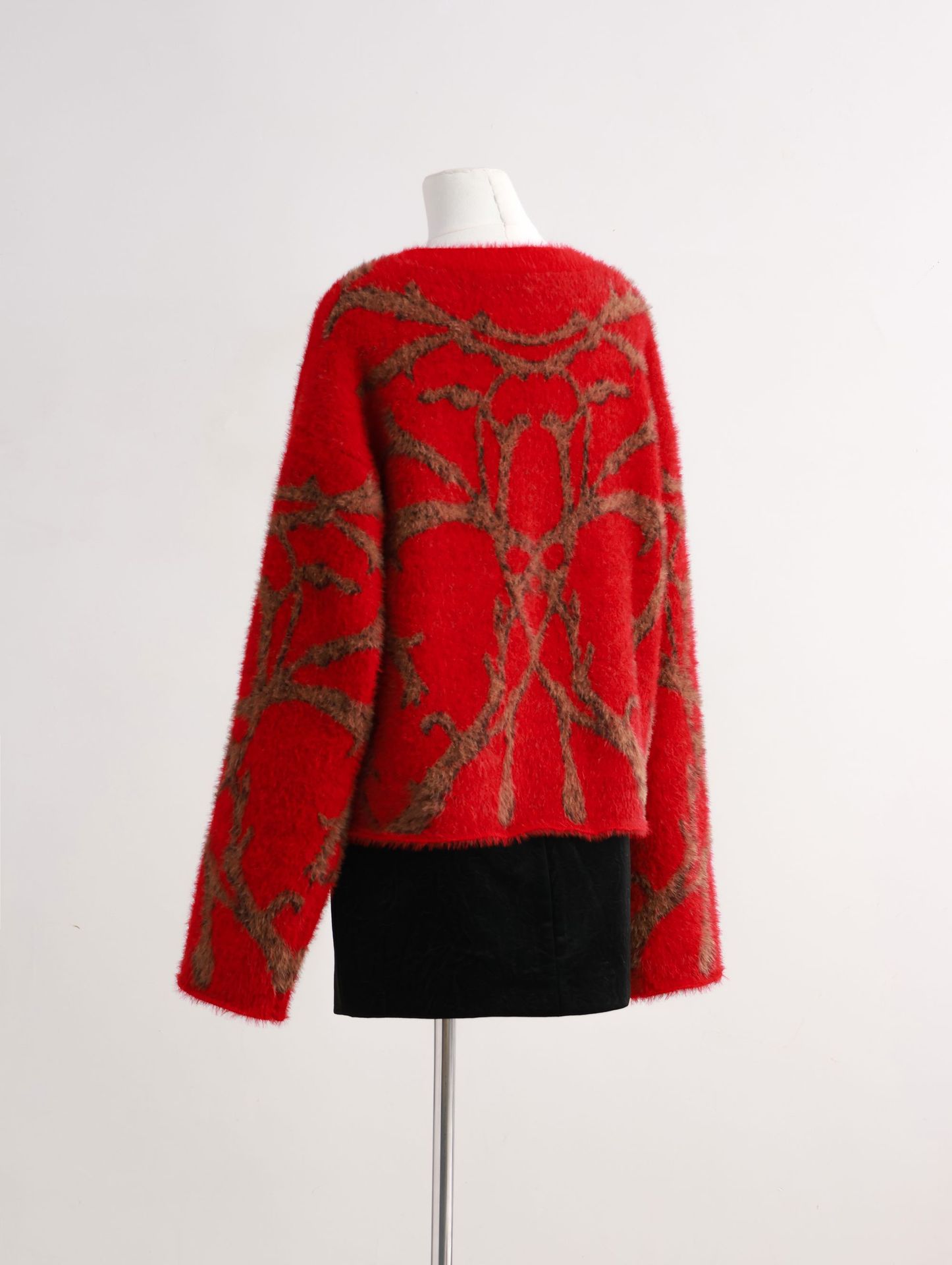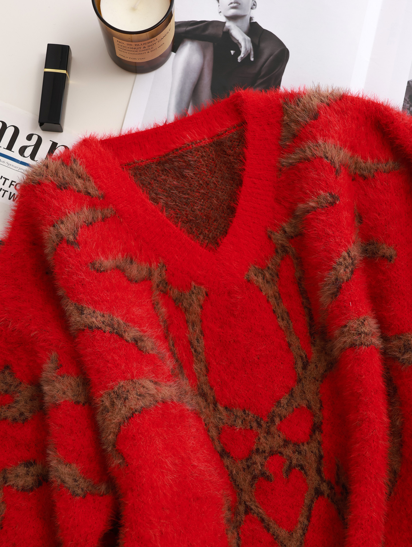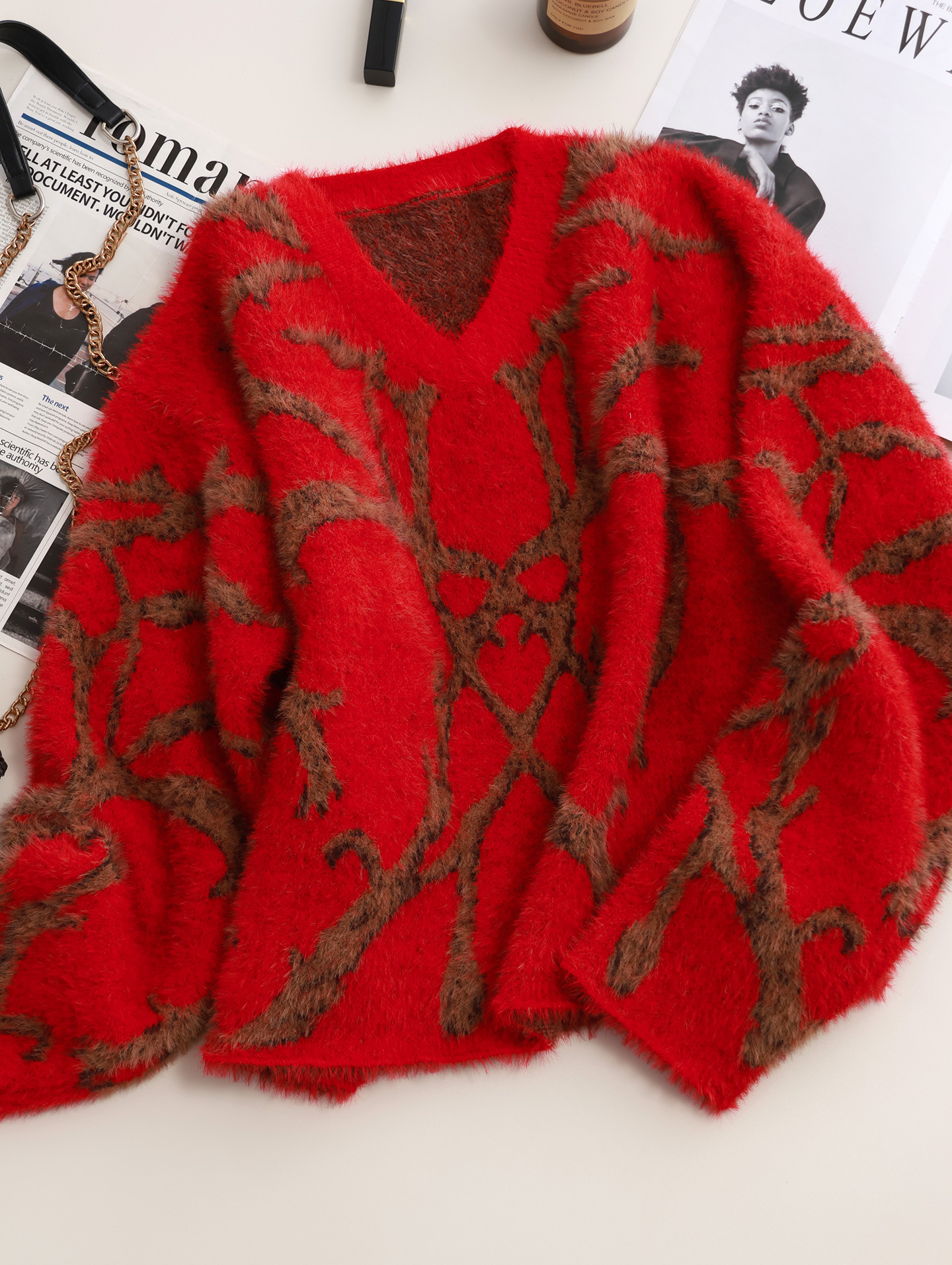 Rode Onregelmatige Jacquard Gebreide Trui Dames Losse Imitatie Nerts V-hals Pullover Trui Sueter Mujer Mohair Lange Mouw Tops