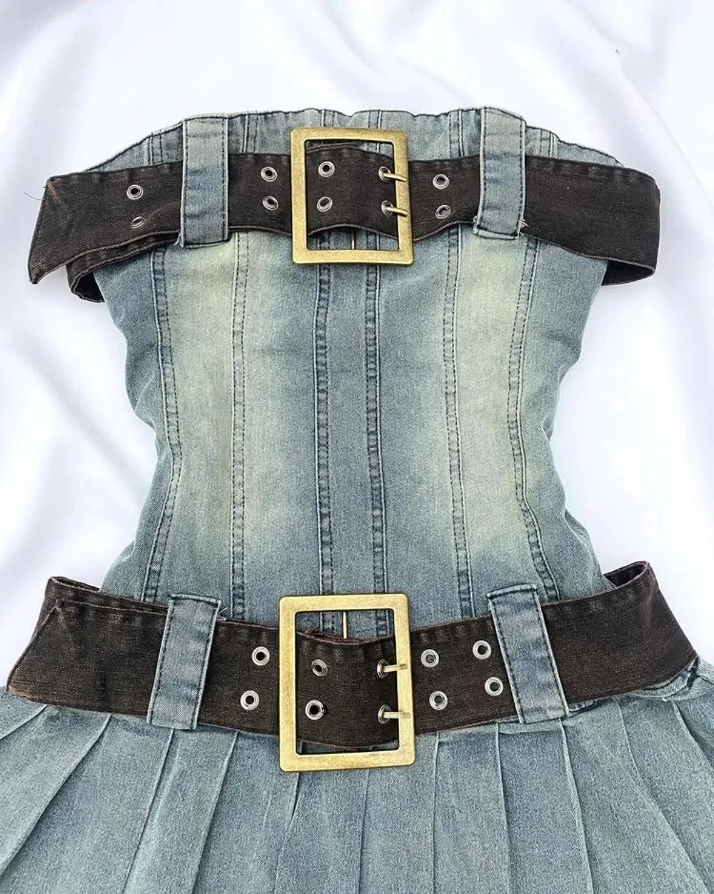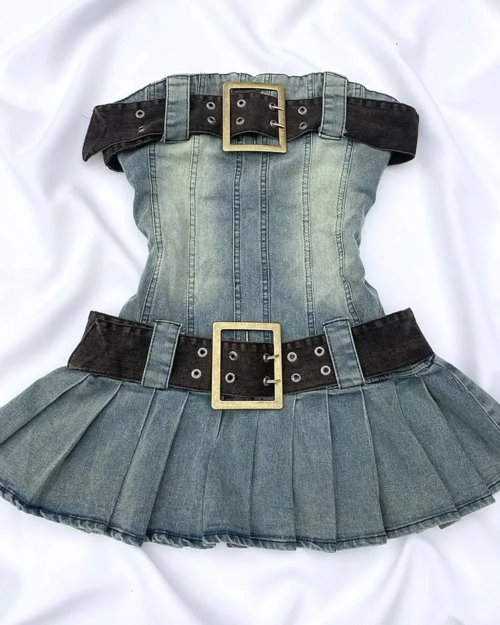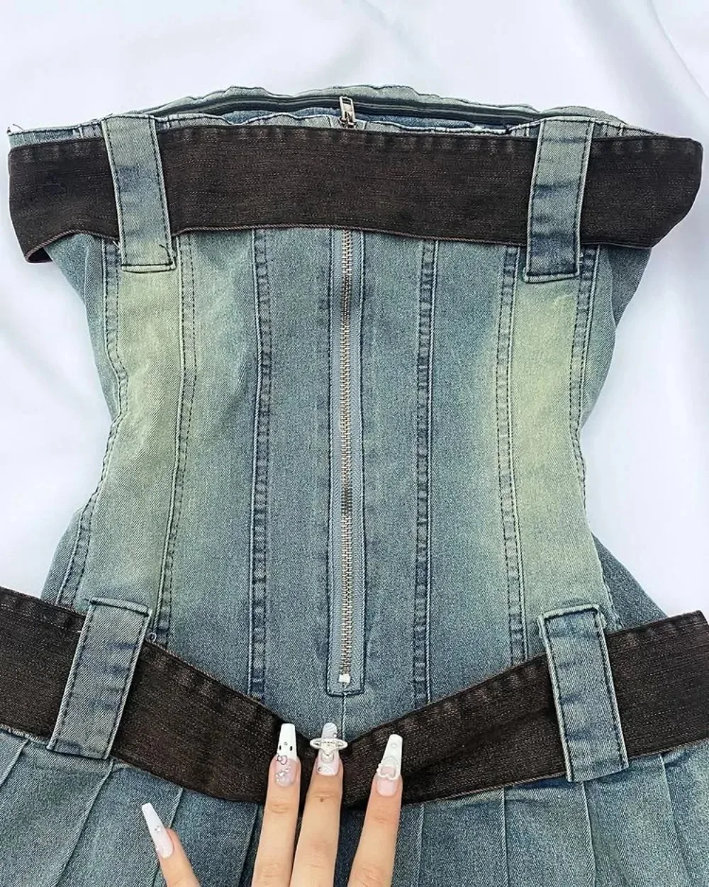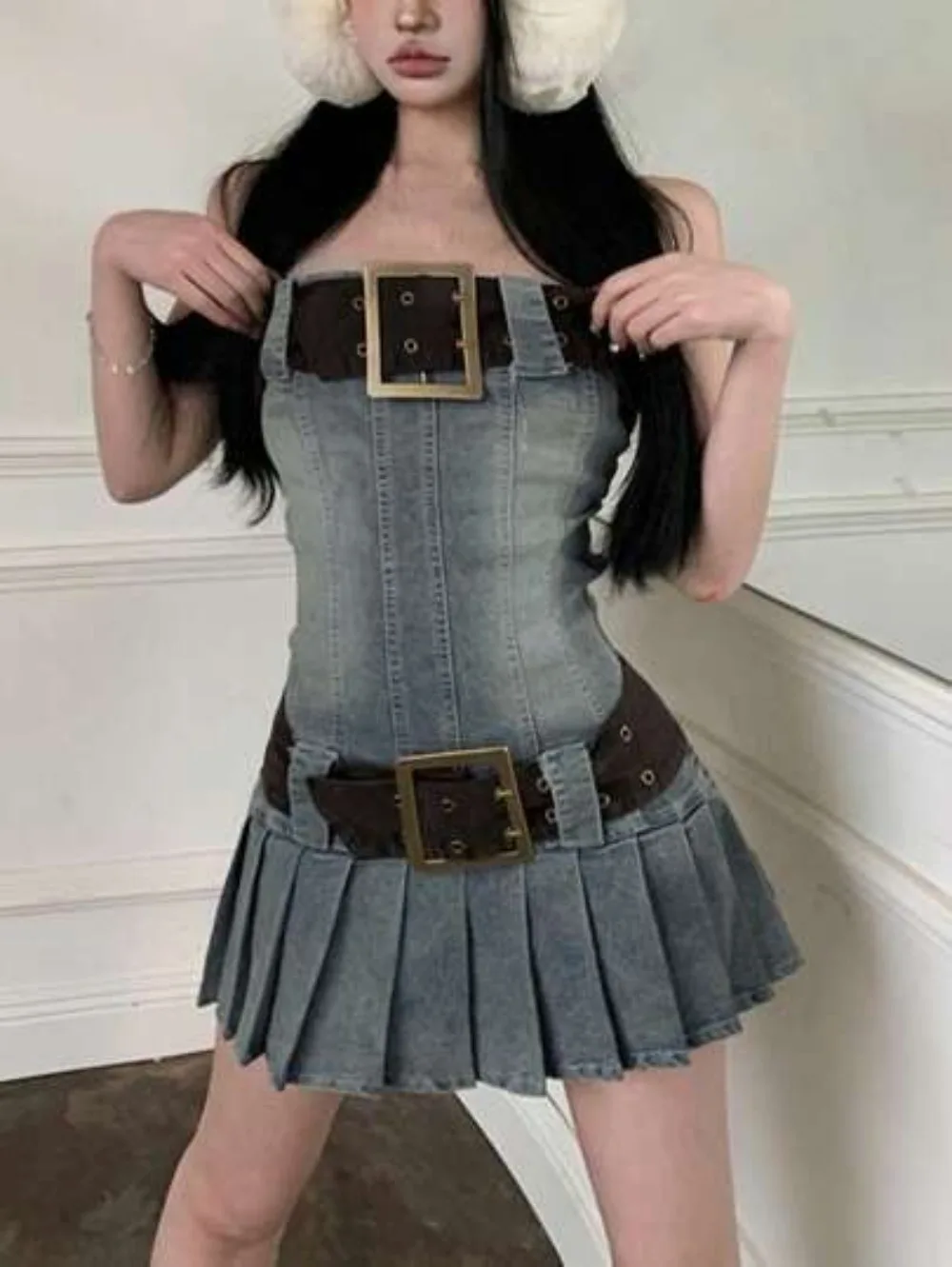 Y2K Retro Denim Mini Zomerjurk Dameskleding Harajuku Jeans Tube Top Rits Sexy Jurk Gotisch Casual Blauwe Riem Plissé Rok